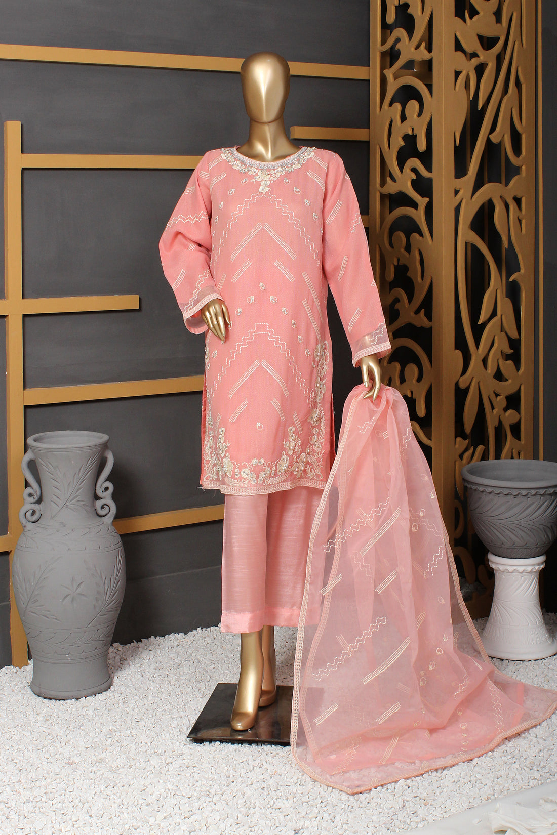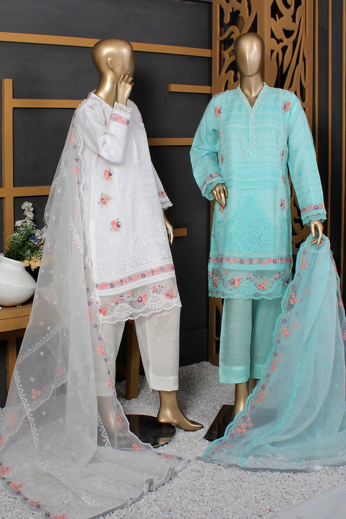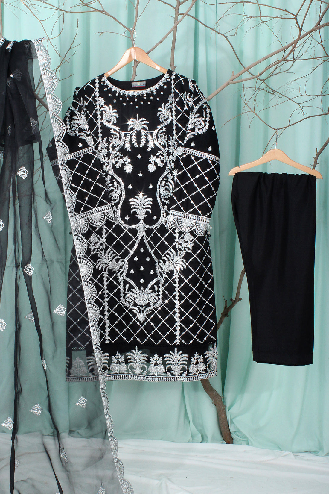 Ready To Wear Shirt fabric: OrganzaTrouser fabric: RawsilkDupatta fabric: Organza A beautifully crafted ensemble featuring an embroidered organza...