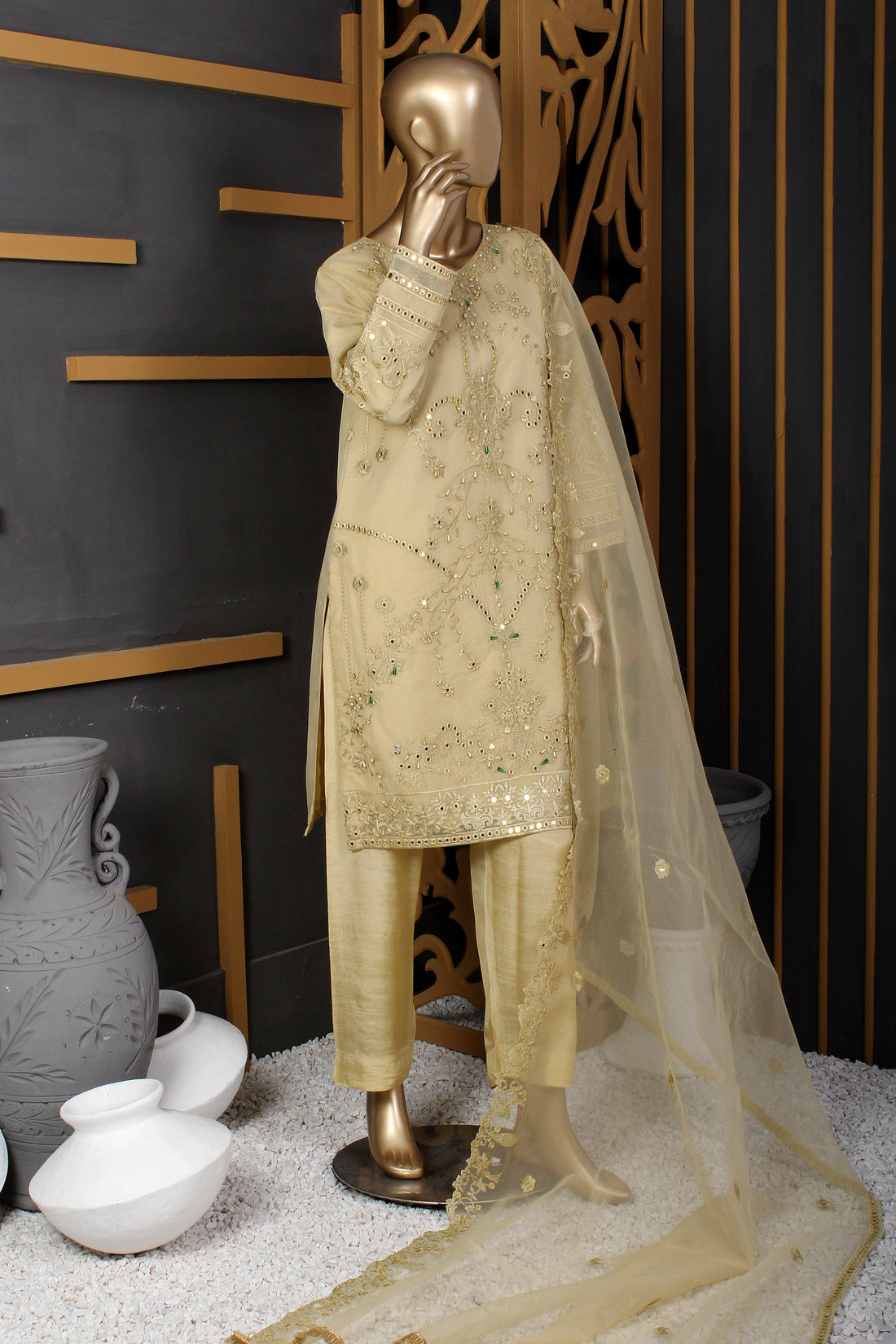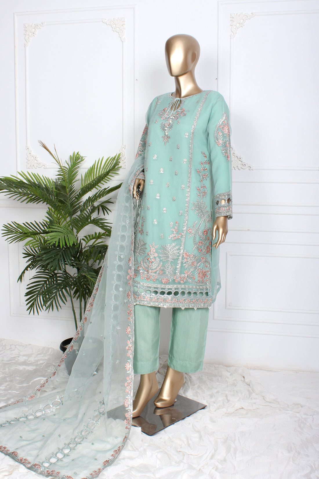 Ready To Wear Shirt fabric: OrganzaTrouser fabric: RawsilkDupatta fabric: Organza Organza shirt adorned with intricate mirror embroidery and...