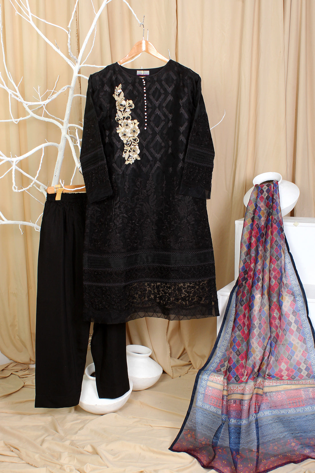 Ready To Wear Shirt fabric: Khaddi Ner Trouser fabric: Poly RawSilkDupatta fabric: Organza This ensemble features a khaddi...