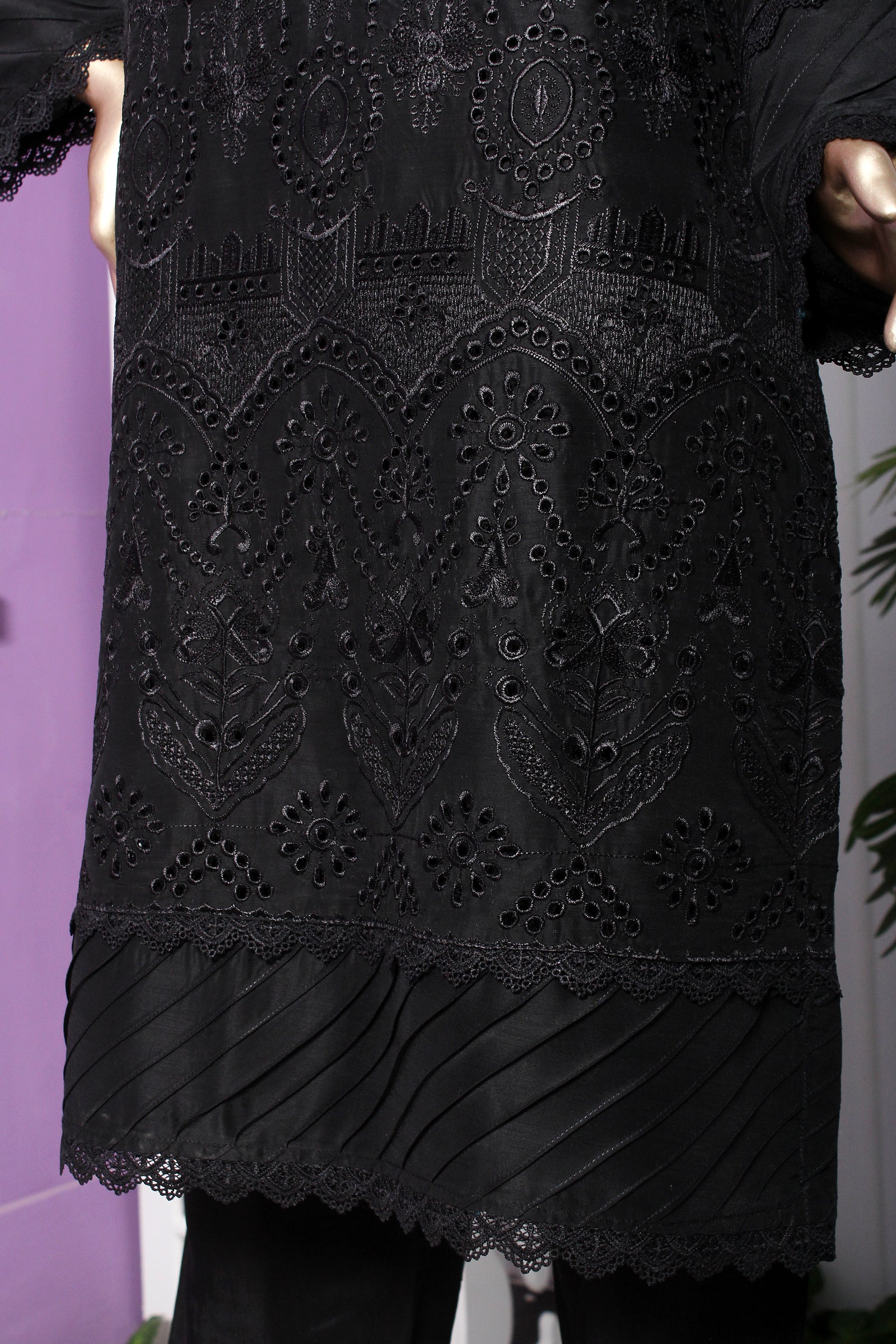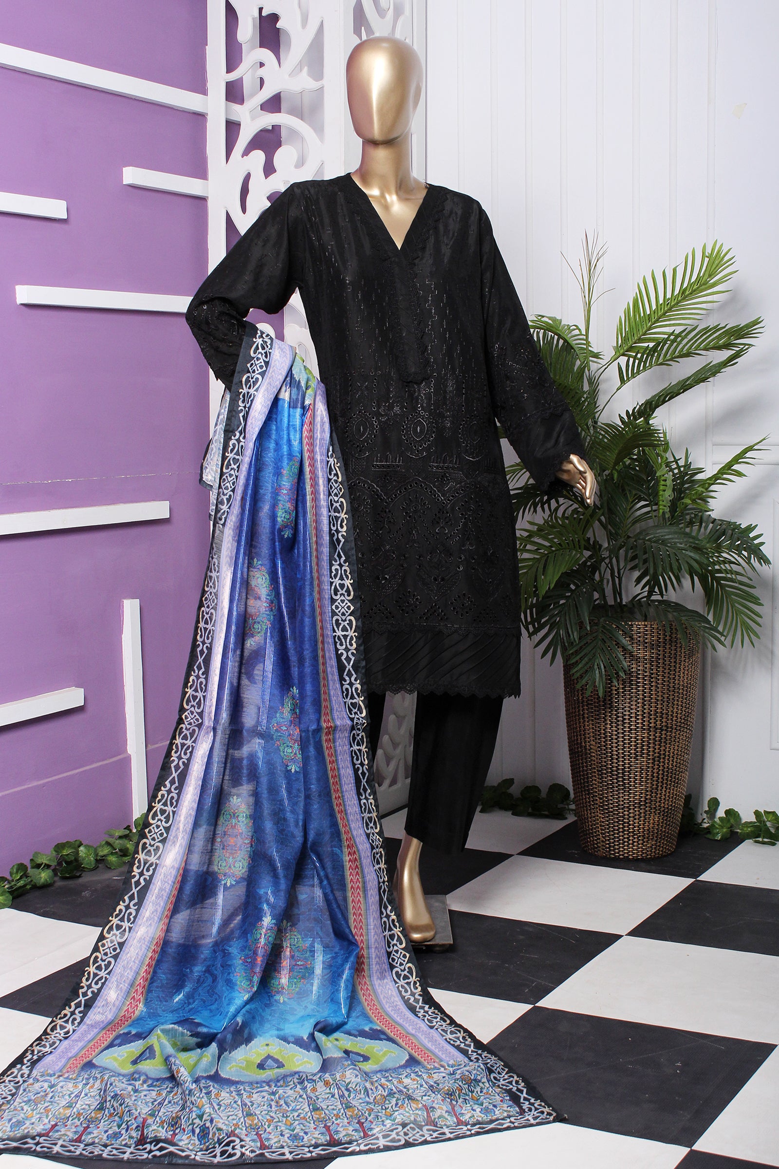 Viscose shirt with full of boring embroidery with laces work on neck , daman & sleeves. Monaar zari digital print dupatta paired with same viscose trouser