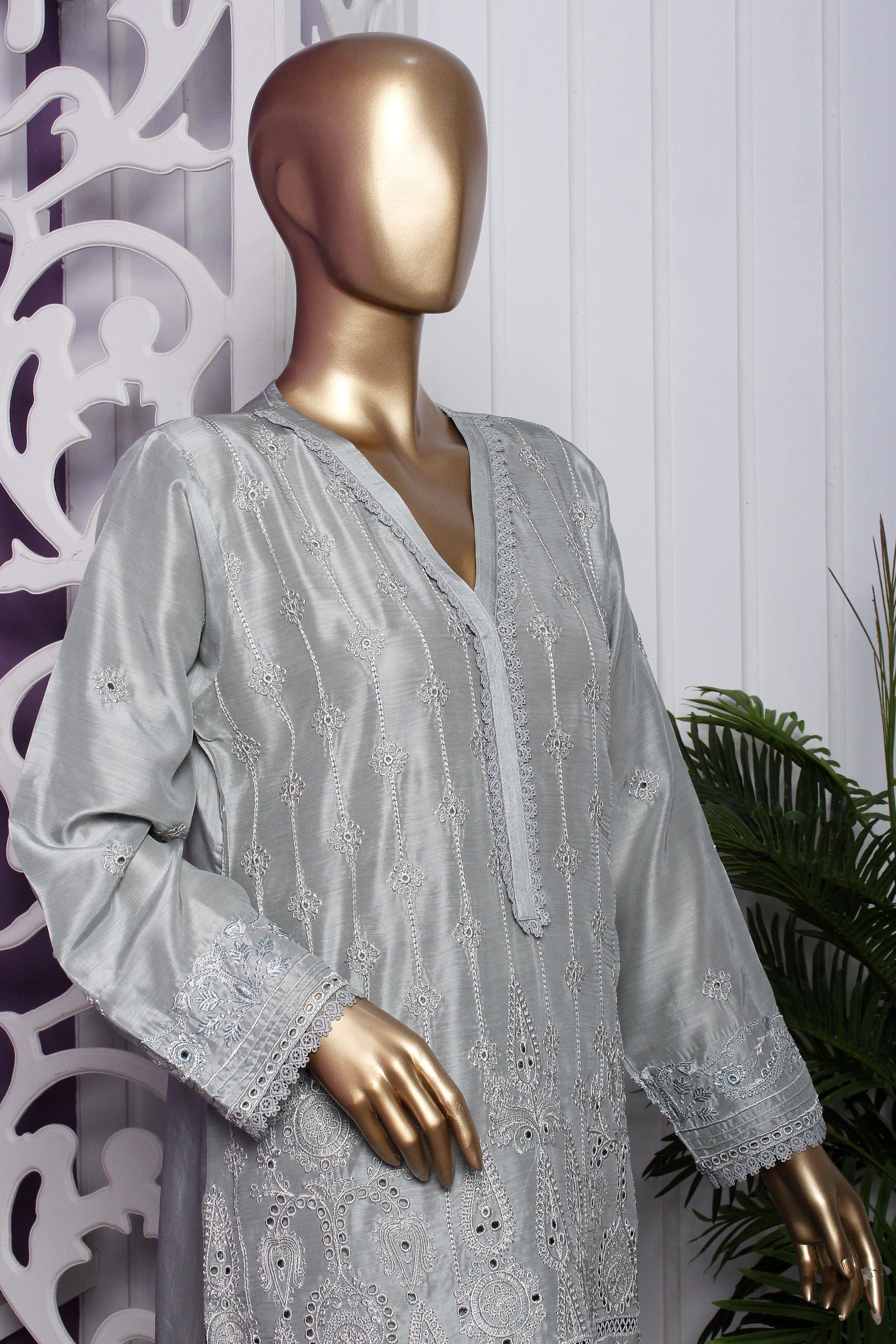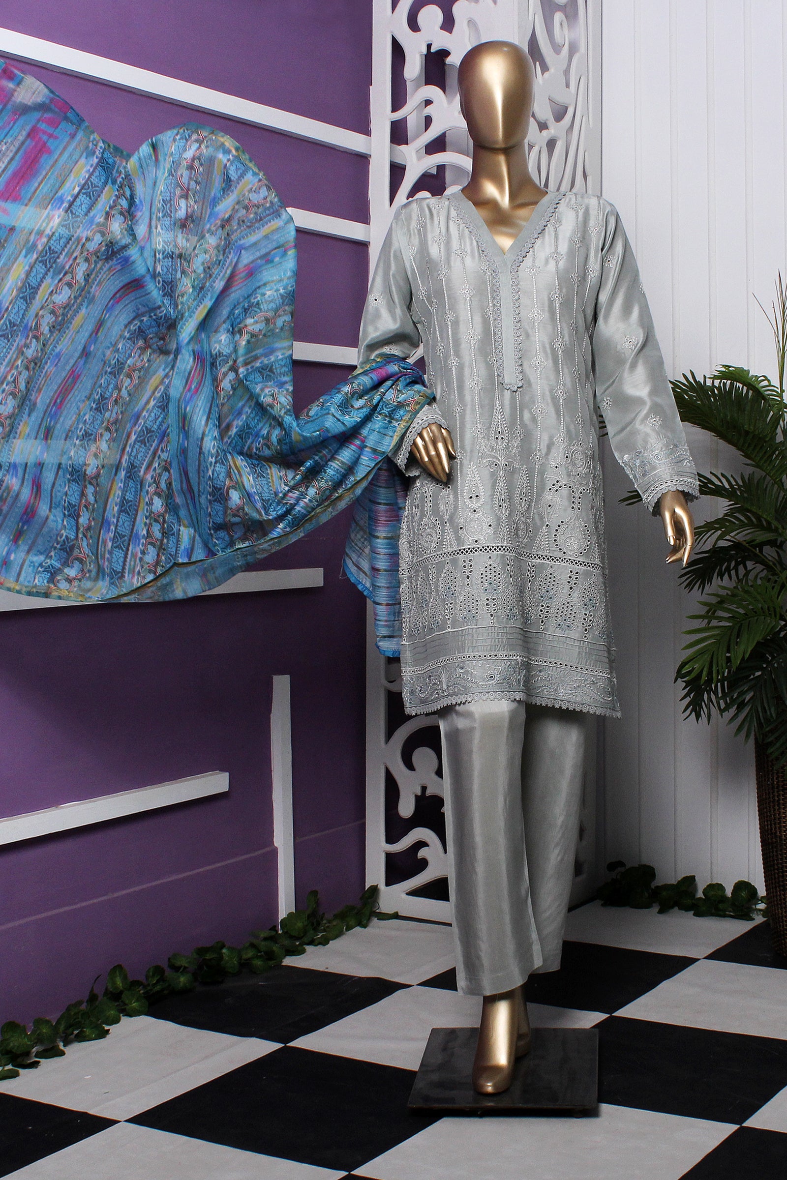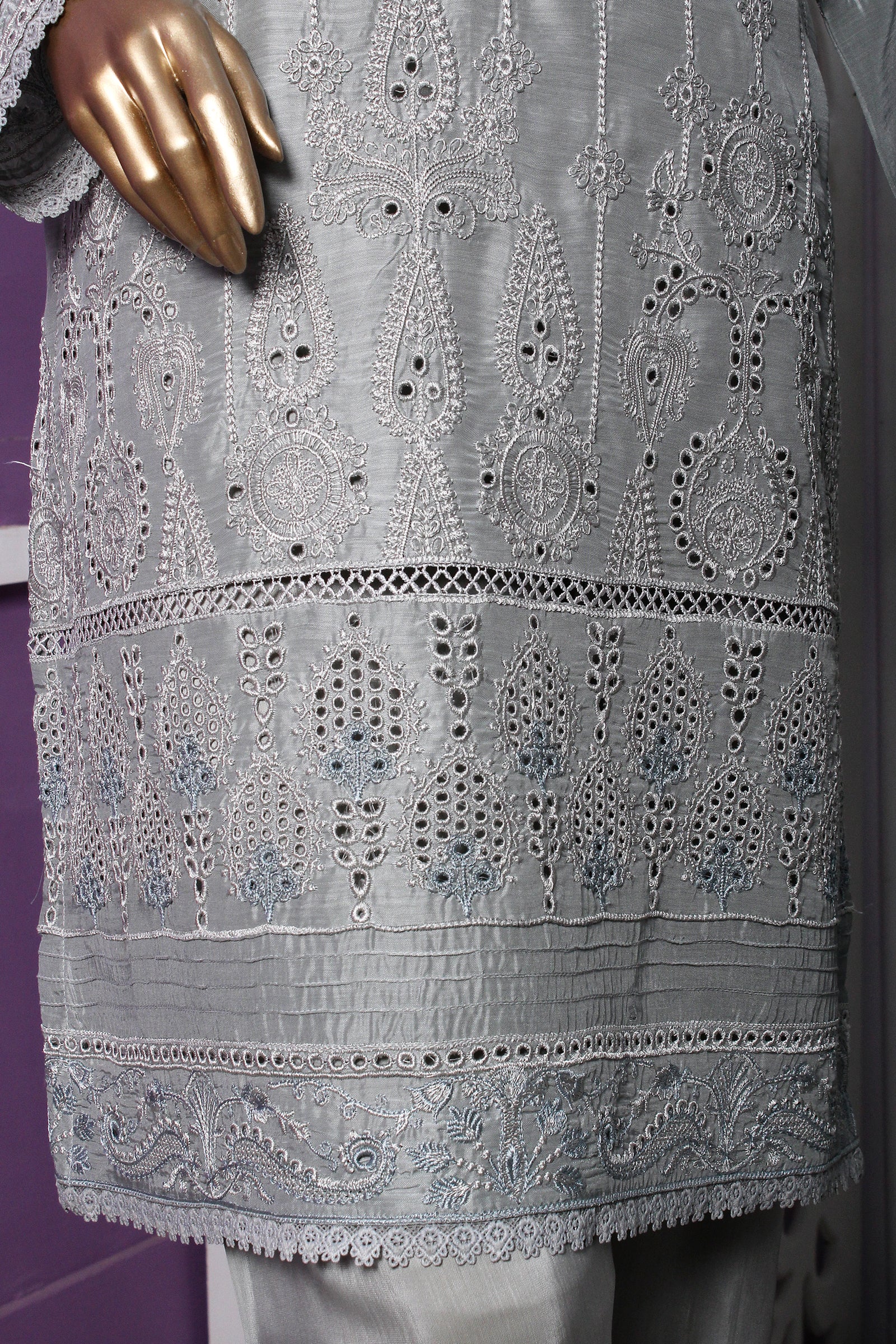 Viscose shirt with full of boring embroidery with laces work on neck , daman & sleeves. Monaar zari digital print dupatta paired with same viscose trouser