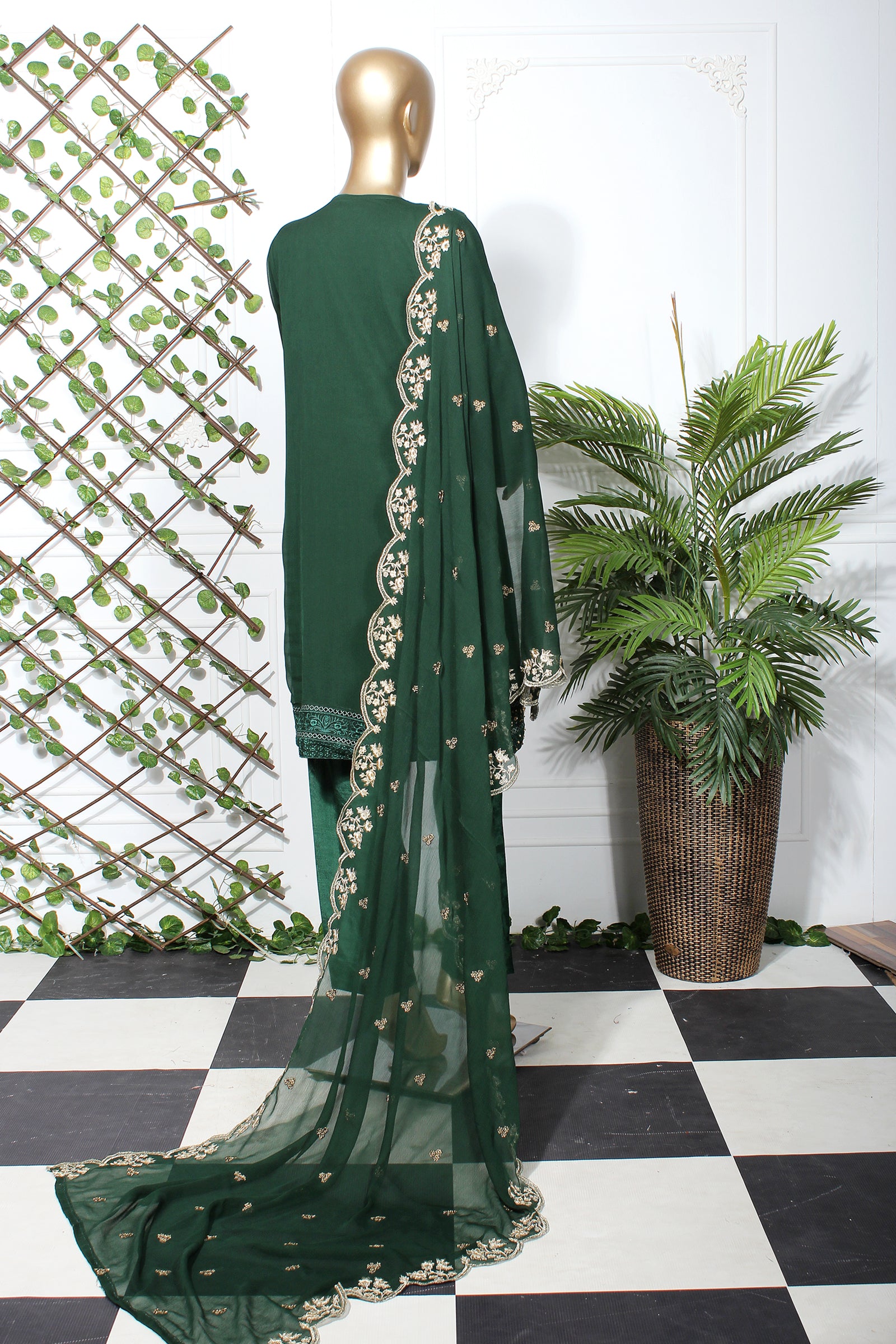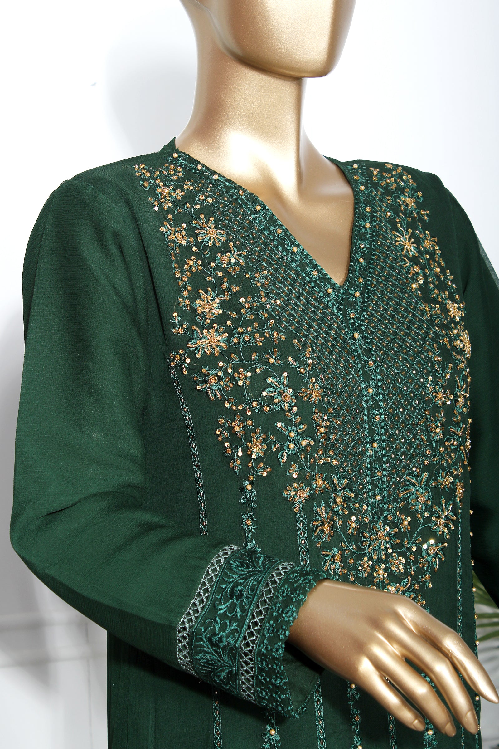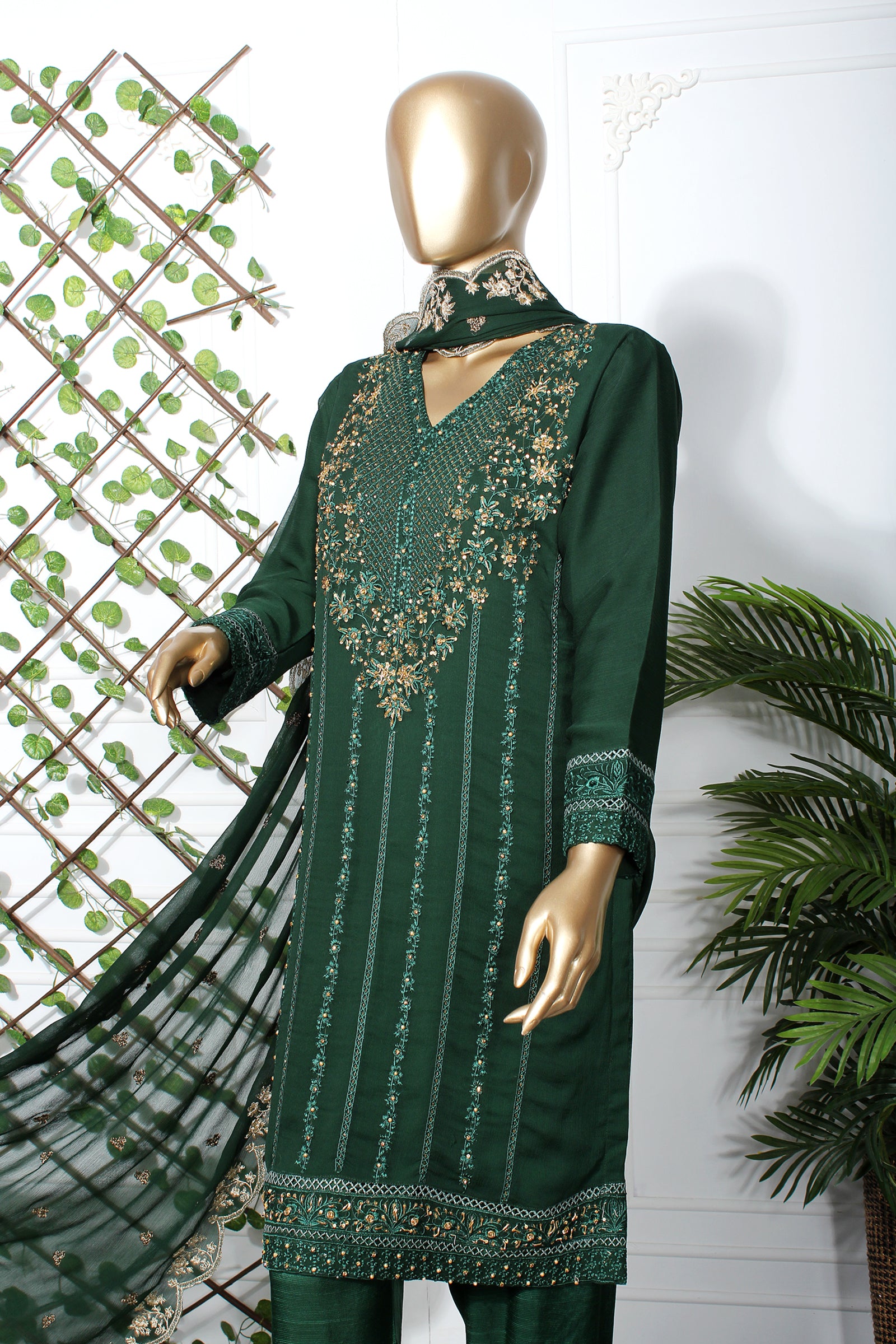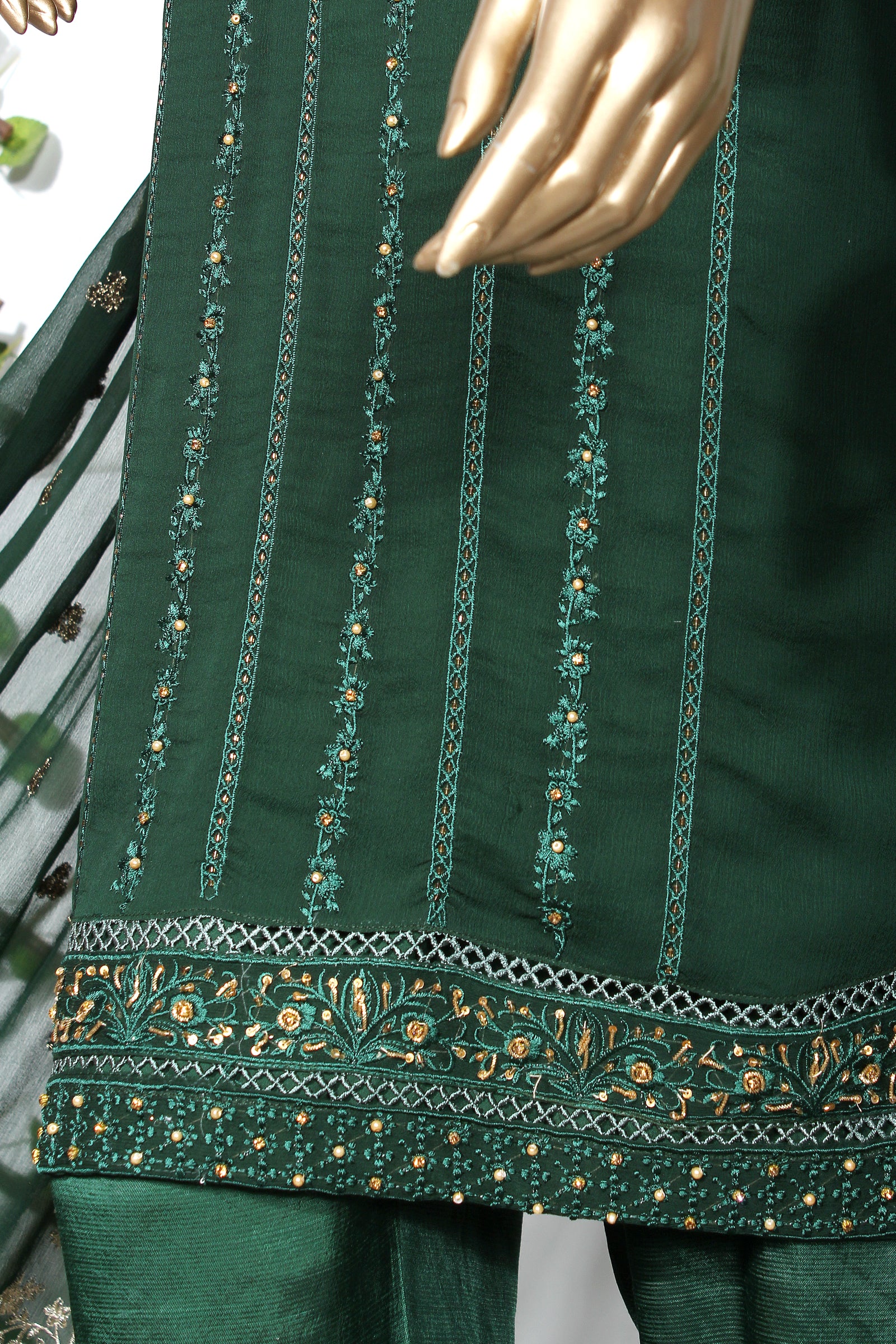 Embroidered chiffon shirt with hand embellished on all front. Embroidered chiffon dupatta with cutwork embroidered border. Paired with same rawsilk trouser.